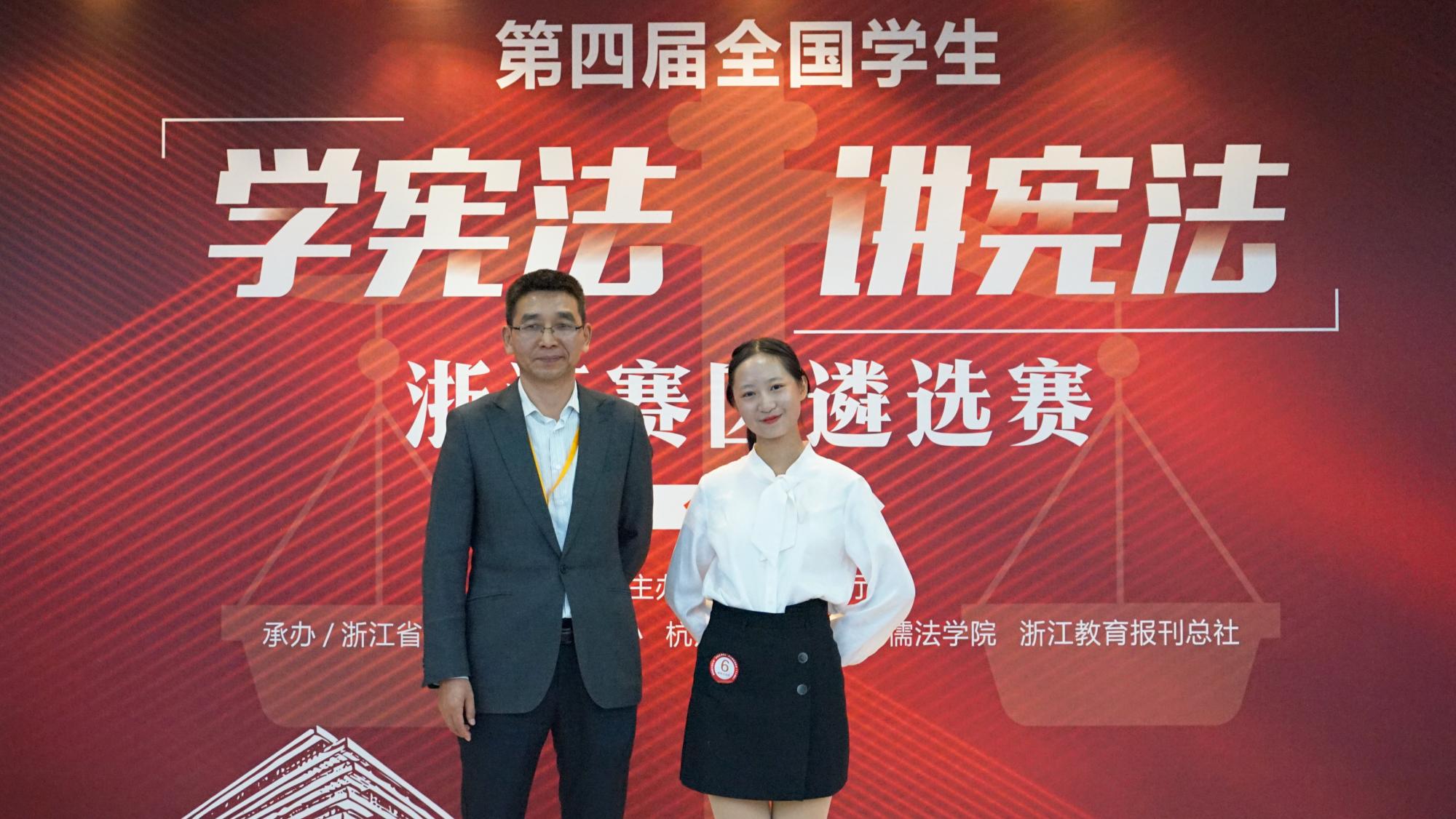参加省赛。比赛中,刘玲妍同学积极应对,一度连续三次抢得答题机会并回答正确得分,精彩表现获得现场阵阵掌声,最终获得知识竞赛一等奖。林汶璇同学紧紧围绕宪法的主题,生动地讲述了《中华人民共和国宪法》的历史渊源和近代发展,探索了《中华人民共和国宪法》联接浙江发展的有效途径。饱满的感情、流利的表达、较强的现场感染力,让林汶璇同学在所有选手中脱颖而出,以第四名的优异成绩斩获一等奖。