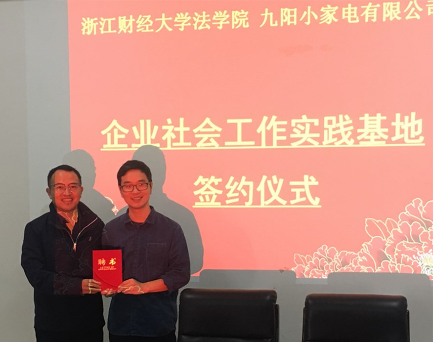 与杭州九阳小家电有限公司企业社会工作实践基地》协议,此协议致力于企业社会工作实践课程、学生参与企业公益活动等方面的合作。九阳股份公益部总监、杭州九阳小家电有限公司指定出席人黄晖,黄漫