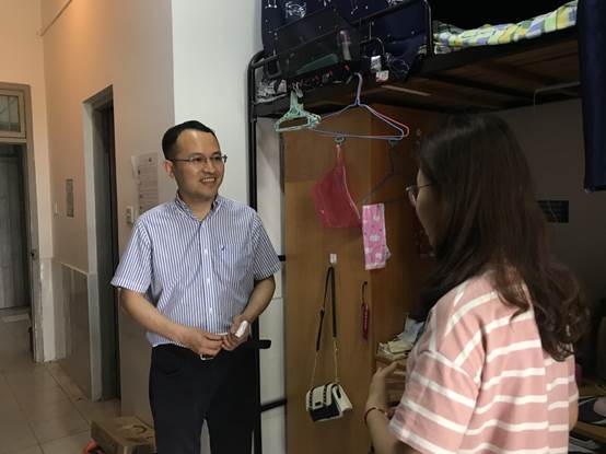 院长童志锋、副院长唐勇、副院长李海龙、党委副书记王文婷、各年级辅导员等一行深入学生寝室,与学生亲切交谈,了解学生返校后的状态,并为每个寝室发放学院防疫物资。
