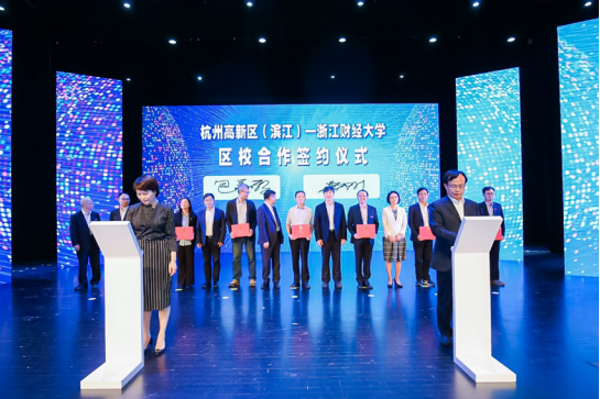 黄建新副书记与滨江区人民政府包嘉颖副区长签订战略合作协议,以多种形式在党建共建、科学研究、社会服务、人才培养、专业培训、研究资源共享等方面推进地校双方全面合作共建。