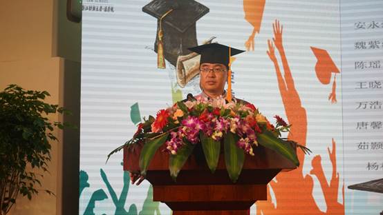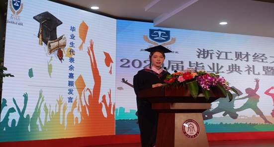 毕业生代表余嘉颖同学谈到自己的大学四年,最大的收获是真正开始自己为自己做决定,在追逐自己的目标中,收获了自己做自己决定的勇气。她充满感恩之心,感谢老师的辛勤教导,感谢学院筹备这样宝贵的毕业典礼,这将成为所有毕业生永生难忘的回忆。