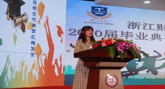 在校生代表贺红梅同学表示十分感谢即将毕业的学长学姐们,因为他们曾给予了懵懂无知的学弟学妹们无微不至的关照和忠实的建议,铺出了一条平坦的求学之路。她真诚地祝福毕业的学长学姐们能够创造出新的辉煌,能够遇见更成功和更优秀的自己。