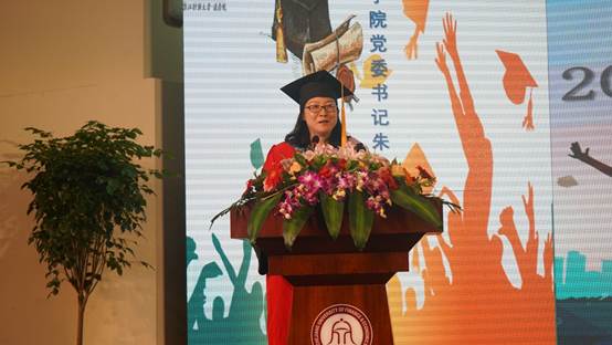 上台致辞。朱丹老师表示毕业生们未来工作或深造,都要乐观向上,常怀感恩之心,积极进取,发扬学校“进德修业,与时偕行”的校训,不懈追求自己的理想信念,都能够成为生活节约、心灵淡泊的人。