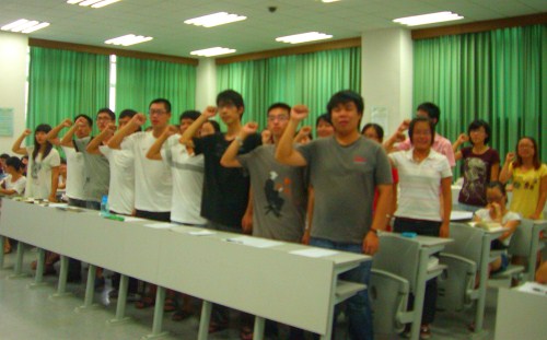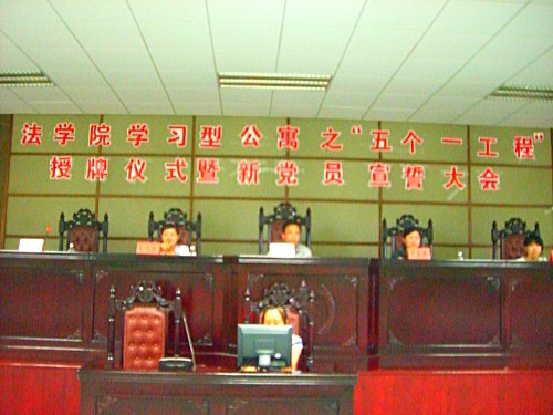 学习型公寓“五个一”工程共产党示范岗进行了授牌仪式,由08法1汤红霞同学和07经济法林辰同学上台领取。学生党员代表08法1金倩如同学发言:党员们在今后的生活中将以“创先争优”为重点,积极开展“五个一”工程,设立多个党员志愿岗,党员服务岗,努力争做党员先锋,不断发挥党员模范作用。大会的最后一项议程,是09年的新党员面向党旗,举起右手,郑重宣誓。