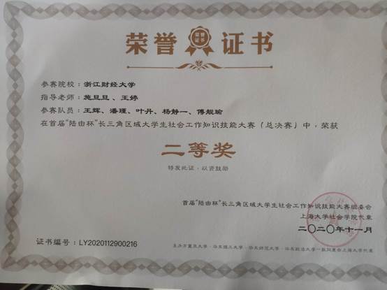 社会工作系学生王辉、潘瑾、叶丹、杨静一、傅靓瑜组成的“财院菜宝社工团”队伍在社会工作系指导老师施旦旦老师、王婷老师的带领下,取得了二等奖的好成绩。