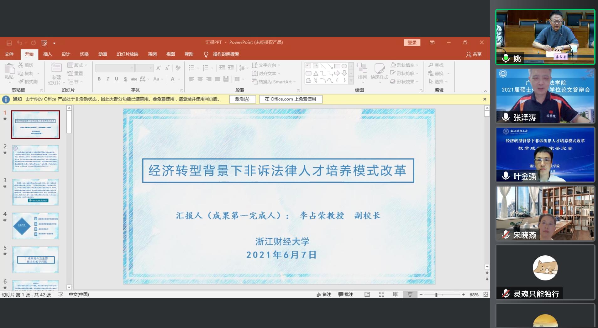教学成果《经济转型背景下非诉法律人才培养模式改革》线上专家鉴定会顺利召开。参与会议的专家包括中国人民大学副校长、教育部法学类专业教指委委员王轶教授,南京大学黄漫
