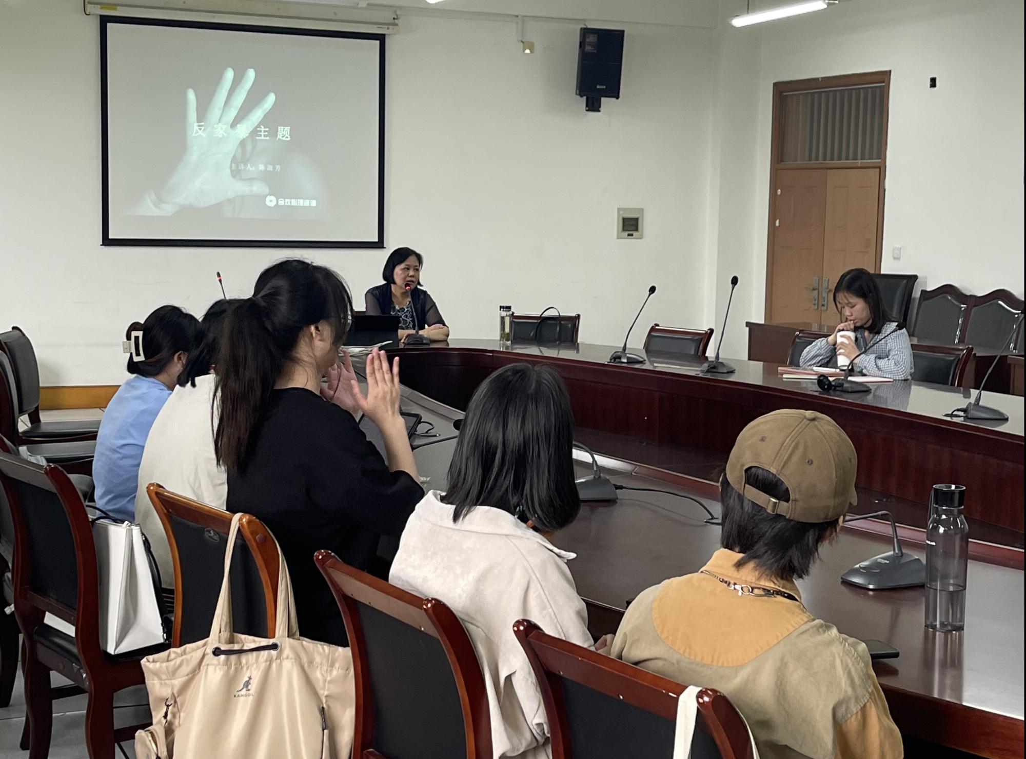 在长达两个小时的分享后,陈老师与社工系学生展开了交流讨论,社工系同学对于陈老师的分享进行提问,陈老师结合自己的成长故事激励学生们向上发展,表达了对各位同学的在学业上的期许和美好的祝愿。通过这次活动,同学们受益颇深,不仅了解到了反家暴的理论知识,也深刻体会到了反家暴实务工作的迫切性和重要性。