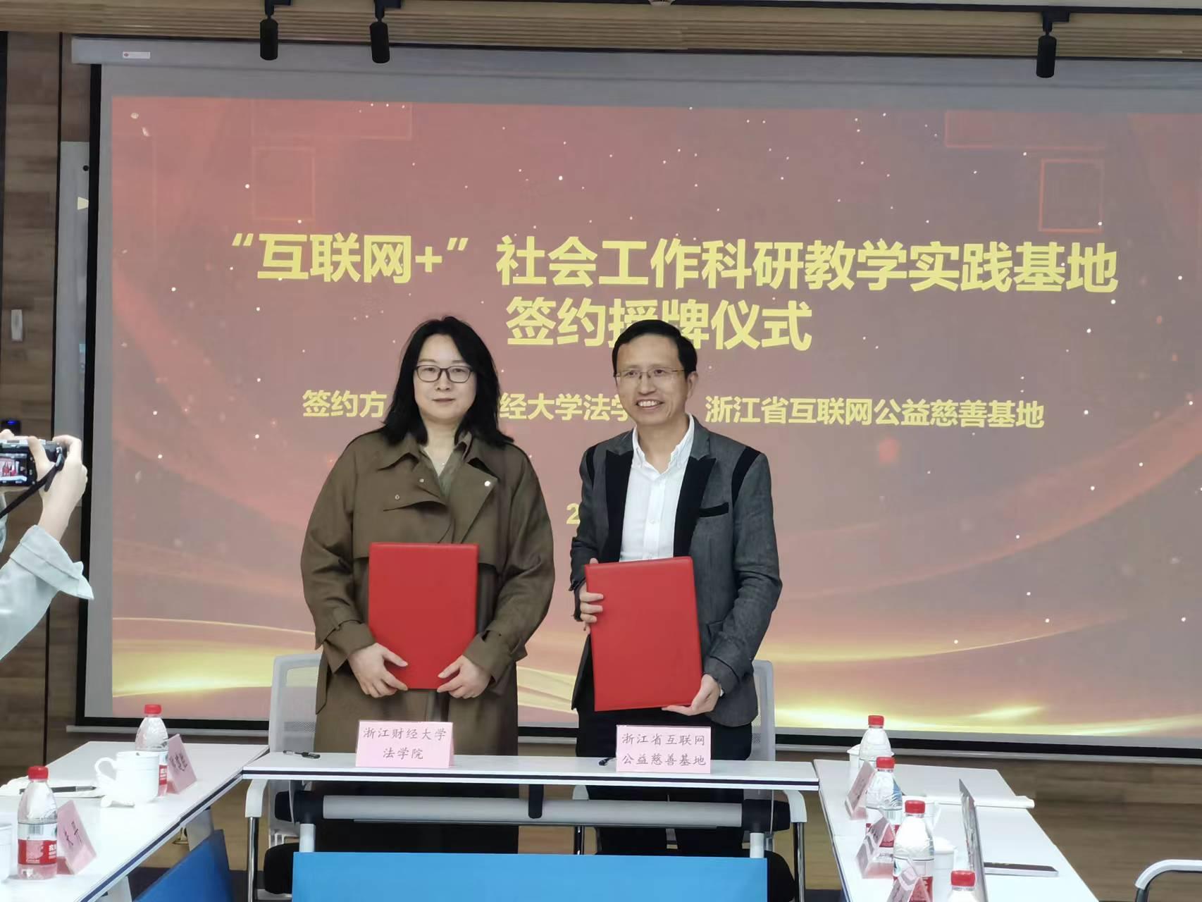 紧接着是实践基地签约仪式。基地主任裘涵与朱丹老师分别代表浙江省互联网公益慈善基地和黄漫