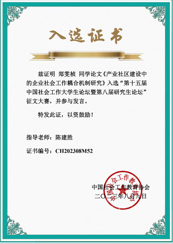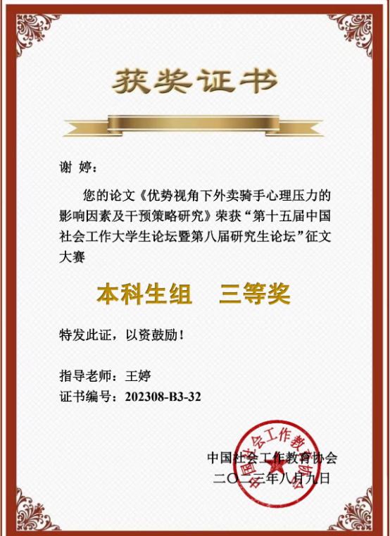 社会工作系学生谢婷(本科生)、郑雯桢(研究生)入选参与本次论坛的大会发言。谢婷同学的论文《优势视角下外卖骑手心理压力的影响因素及干预策略研究》(指导老师:王婷)荣获本科生组三等奖。