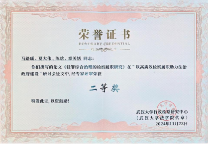 马路瑶博士在会上就《轻罪综合治理的检察履职研究》论文做报告,就轻罪综合治理的时代背景、轻罪的概念界定、刑事诉讼阶段轻罪综合治理的检察履职路径、刑事执行阶段轻罪综合治理的检察履职路径、轻罪前科消灭制度建立过程中的检察履职路径等内容发表观点。该论文经专家评审获得二等奖。