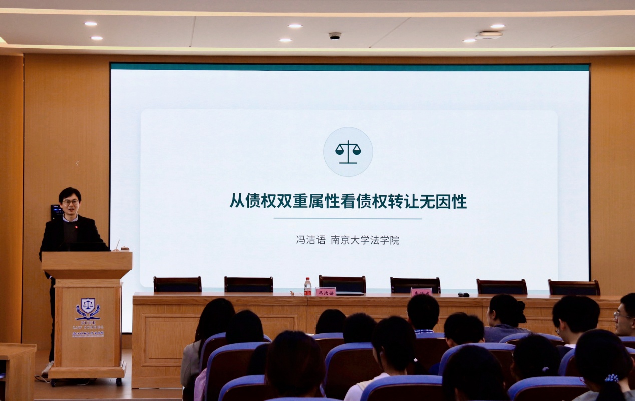 讲座中,冯洁语教授以债权让与制度的历史发展为切入点,系统讲解了该制度从罗马法到近现代大陆法系的演变历程,重点解读了债权从“法锁”到可流转财产权的理论突破。针对我国债权让与无因性的学术研究现状,冯教授梳理了不同理论观点的核心分歧,结合民法典相关条款,分析了基础关系瑕疵、债务人清偿效力等实践关键问题。同时,他从双重理论视角切入,深入阐释债权让与无因性的构成逻辑与制度价值,为师生理解相关法律规则提供了全新视角。