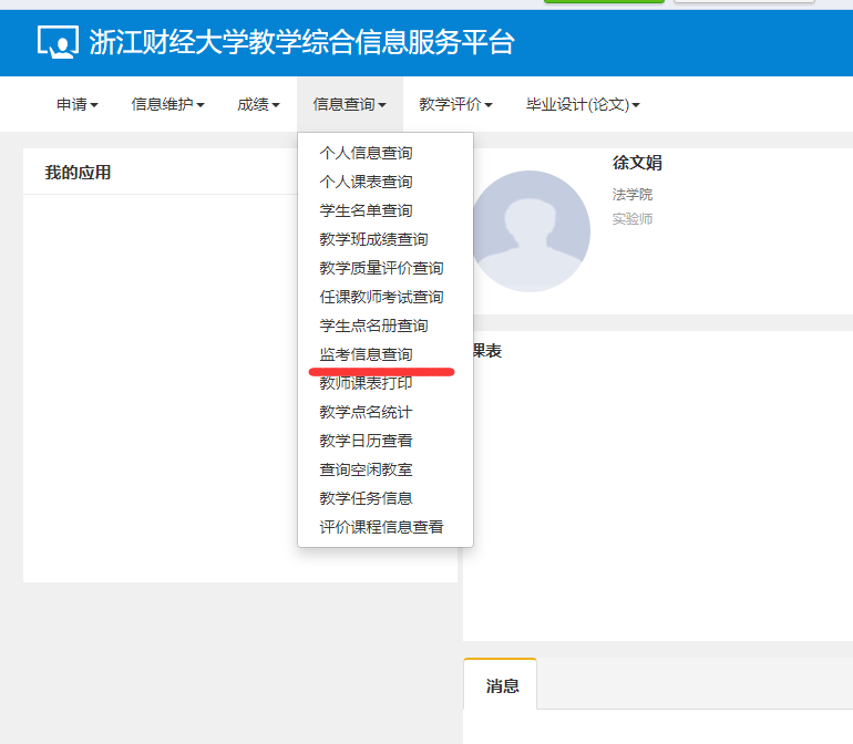 具体查看途径:信息门户-教务系统-信息查询-监考信息查询-考试名称选择(期末监考)详情请见下图
