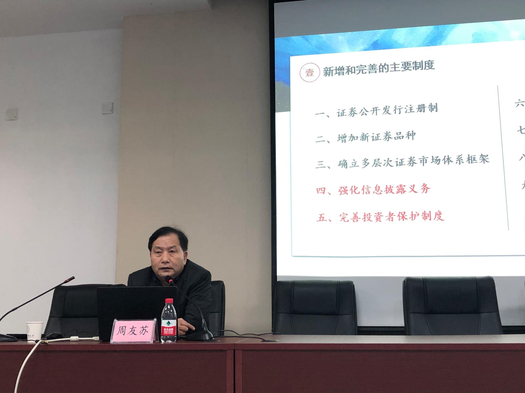 11月26日,四川省社会科学院研究员,中国法学会商法学研究会副会长,中国法学会证券法学研究会副会长周友苏教授做客“鹅湖讲坛”,为黄漫