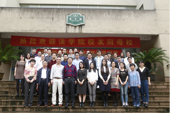 楼下拍照合影。岁月改变了年轻的脸庞,却没有改变他们那颗热爱母校的心。在学院楼下,校友们纷纷将自己对学校的缕缕情丝写进卡片并系在门口生气盎然的大树上。风雨中飘舞的缕缕绦丝,诉说着脉脉动人法情。