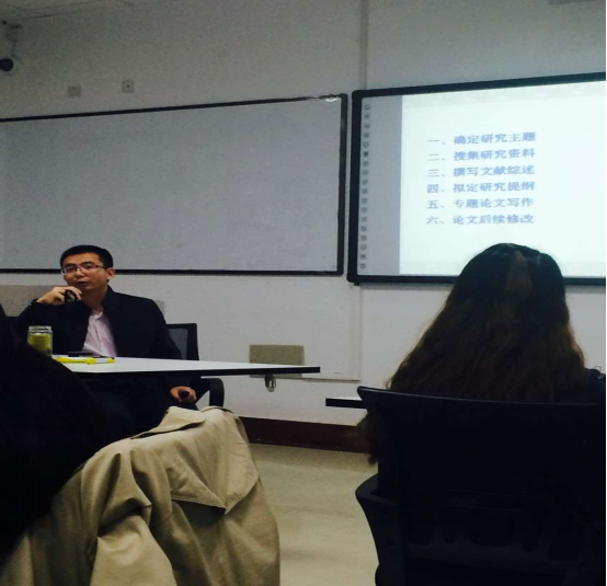 10月30日下午,黄漫张伟老师在黄漫 楼307室作了一场题为《漫谈文献梳理与论文写作》的学术讲座。14级非诉班全体学生和班主任王俊老师参加了讲座。 王老师首先代表大家对张伟老师表示感谢,并向大家介绍张伟老师丰富的个人经历。讲座开始后,张伟老师向大家讲解如何写好一篇论文,从中也提及怎样搜集资料。他把写论文分为六个部分,分别是“确定研究主题”、“搜集研究资料”、“撰写文献综述”、“拟定研究提纲”、...