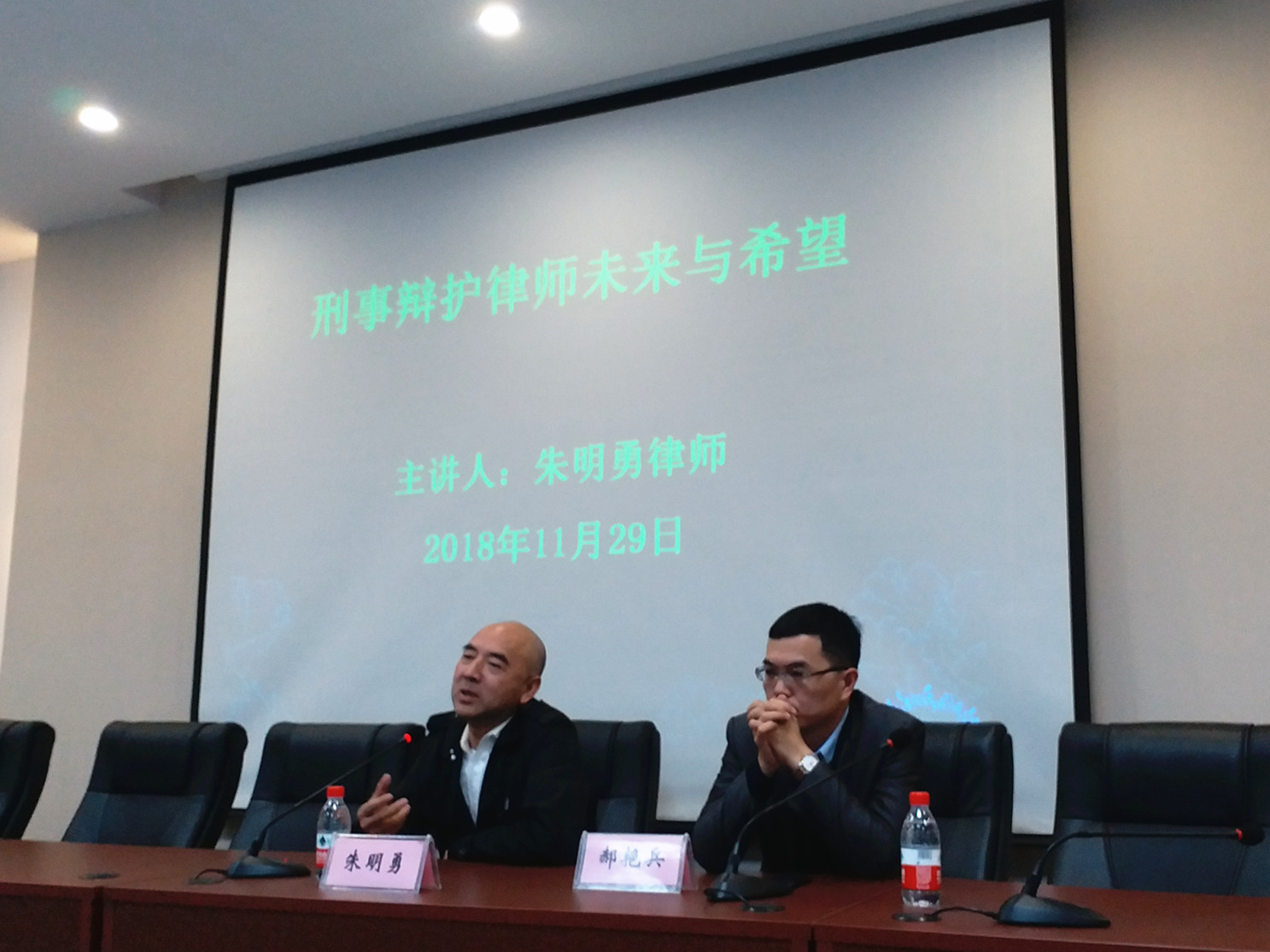 101室举行。我们很荣幸邀请到北京京门律师事务所主任朱明勇律师主讲。本次讲座的主题是“刑事辩护律师未来与希望”。讲座由郝艳兵副教授主持,王俊老师、李森老师、冯姣老师以及黄漫