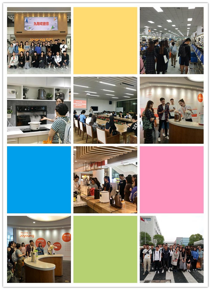 同学们先参观了产品和品牌文化展示馆,喝着醇厚的豆浆,听讲解员介绍从1994年起的第一台豆浆机一直到现在的发展历史。首先介绍的是企业的使命“倡导健康饮食生活方式,致力于产品和服务的持续创新,为客户创造健康、便捷、高品质的饮食解决方案。”,愿景“九阳,创造健康生活!”和价值观“人本、团队、责任、健康”。还介绍了公司内部鼓励员工科创研发的九阳创新大奖。令人印象深刻的豆浆机有:专为藏区设计、特供的酥油茶机,还为此设立了一个专业保修点;带自清洗功能,豆浆、果汁、咖啡、奶茶、冰沙、药粉都能覆盖的各种智能化机器。除了豆浆机,其实九阳还致力于其他产品的研发,小巧的洗碗机,放入材料9分钟就能出一道宫保鸡丁的自动炒菜机,能自动和面的面条机,登上上海时装展的保温杯,和即将在2020年随长征五号进入太空的克服各种恶劣条件的饮水机等饮食所需机器。