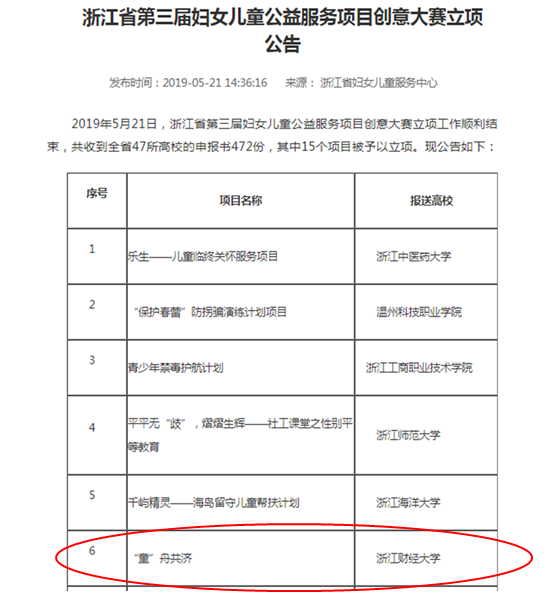 附:浙江省第三届妇女儿童公益服务项目创意大赛立项公告://www.zjswomen.org.cn/ch118/system/2019/05/21/031663398.shtml